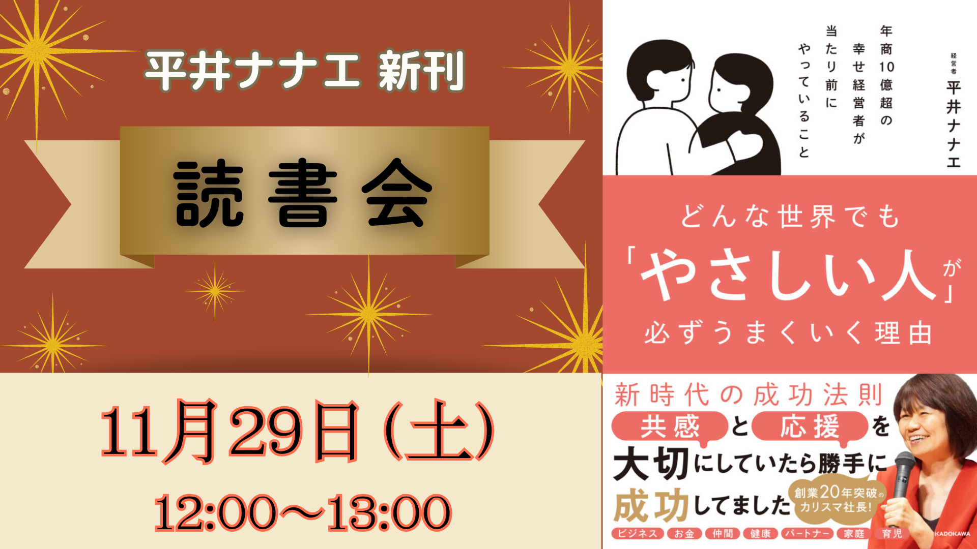 どんな世界でも「やさしい人」が必ずうまくいく理由みんなで集まって、著者の平井ナナエさんから直接話を聞ける読書会に参加しませんか?ナナエさんの答えが、あなたにとって今必要なヒントや気づきをもたらしてくれることでしょう。この読書会は、ただ本を読むだけでなく、 一緒に素敵な時間を共有できる、とっても特別な時間です^^