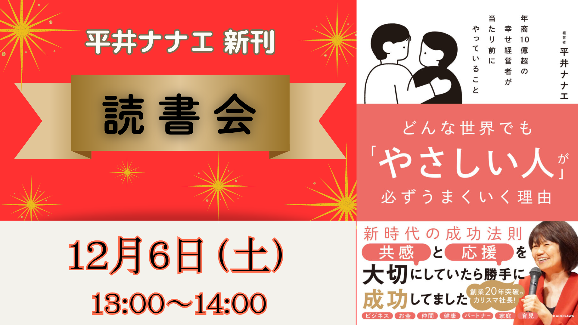 どんな世界でも「やさしい人」が必ずうまくいく理由みんなで集まって、著者の平井ナナエさんから直接話を聞ける読書会に参加しませんか?ナナエさんの答えが、あなたにとって今必要なヒントや気づきをもたらしてくれることでしょう。この読書会は、ただ本を読むだけでなく、 一緒に素敵な時間を共有できる、とっても特別な時間です^^