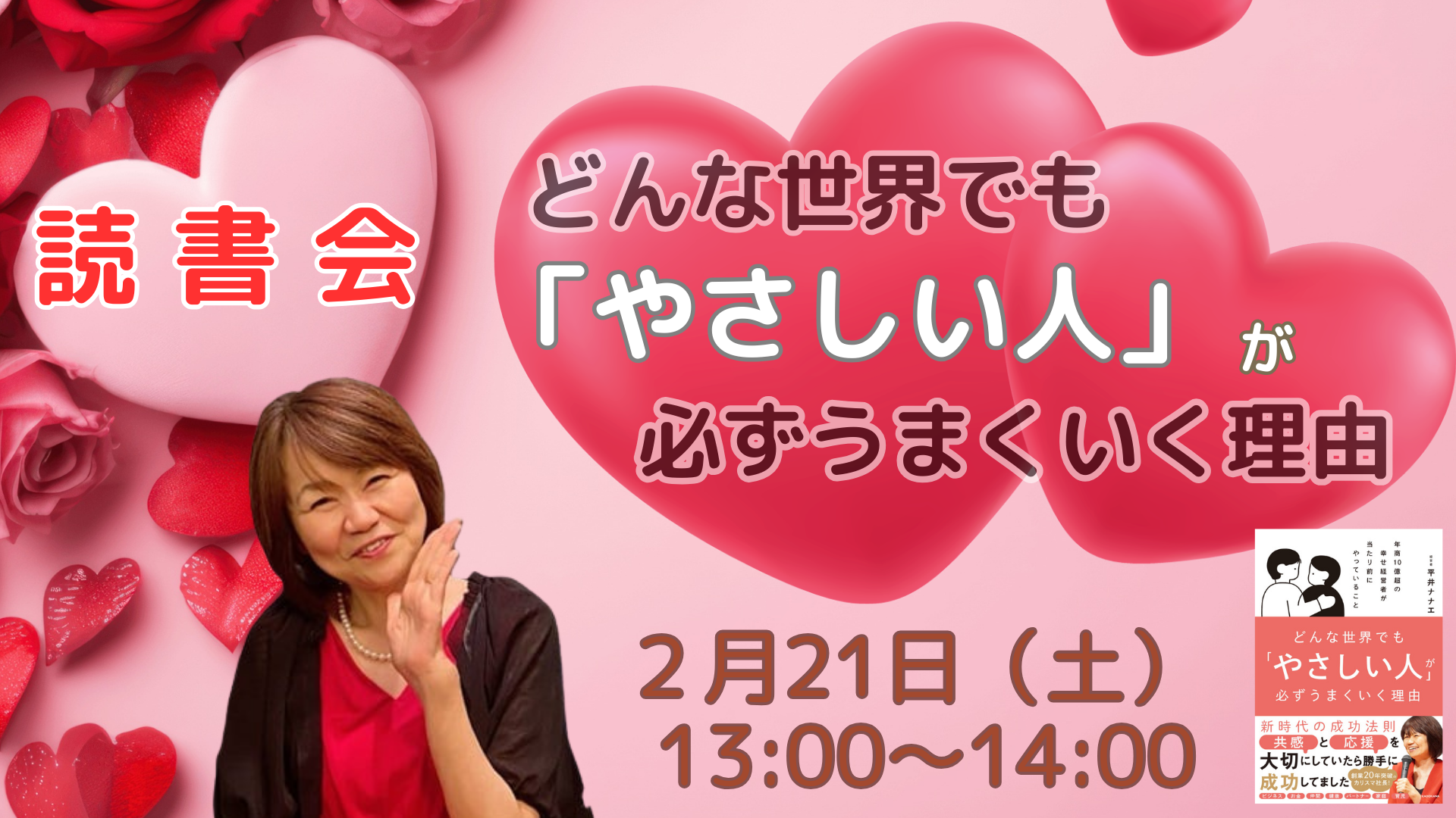 どんな世界でも「やさしい人」が必ずうまくいく理由みんなで集まって、著者の平井ナナエさんから直接話を聞ける読書会に参加しませんか?ナナエさんの答えが、あなたにとって今必要なヒントや気づきをもたらしてくれることでしょう。この読書会は、ただ本を読むだけでなく、 一緒に素敵な時間を共有できる、とっても特別な時間です^^