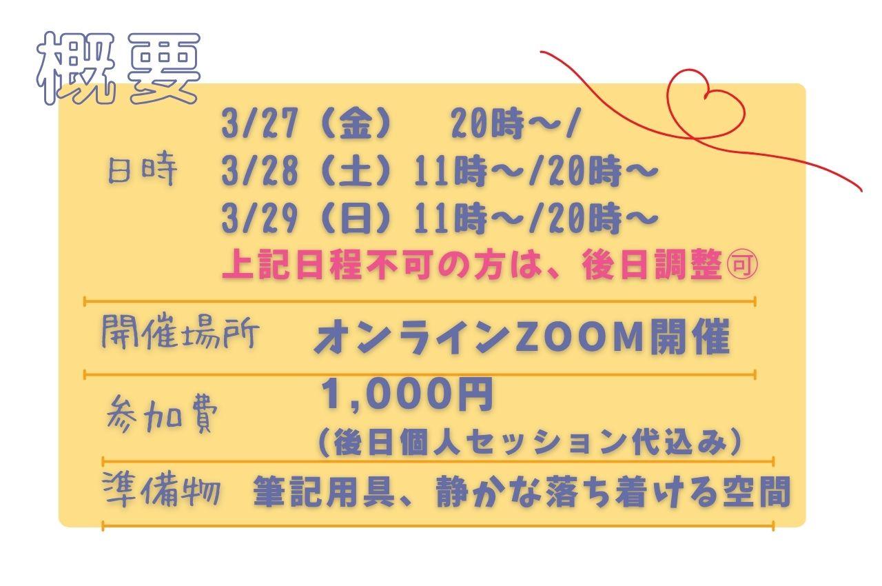 生まれ持った資質の鑑定の為、生年月日をご記入下さい。 マルシェ期間後のWS日程調整ご希望の方⑥、ご希望日の第3希望までお知らせ下さい。 お申込み欄はシステム上4/2となっておりますが、4/2以降とご理解くださいませ。 特典の個別セッションと同日の60分枠とさせて頂きます。 追って日程確定、ご相談メールを差し上げますので、しばらくお待ちください。
